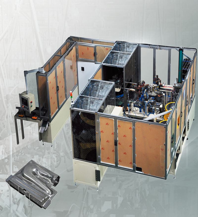 7、设备整体布局为A、B工作站,AB站可同时生产,大大提高效率,也可以单独生产,灵活适应不同情况下的要求,本机和冲床连接,节省操作工2人以上,经济效益明显;